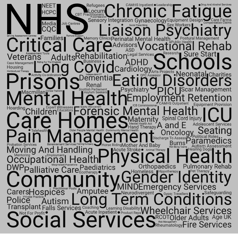 “There’s a belief that Occupational Therapists can work anywhere, but actually the doors are kind of closed and how we can kind of navigate that” “Where people are in their careers, wobbly careers outside of healthcare, portfolio careers” “Change in in careers for occupational therapy – broadening our understanding of what is successful occupational therapy career looks like” “ better awareness of career paths and people’s experiences/journey/roles to broaden thinking around professional development” “Case studies of career journeys” “Knowledge of options – increasing awareness of what options exist” “Confidence to know that a career can cross many disciplines and areas of expertise but our core occupational therapy skills are the key element” “OT land and what exists in OT land for the OTs who want to progress their careers” “more stories of different career paths including non-occupational therapy roles” “inspiring and raising the awareness of being able to be more as an OT” “Knowledge of what is out there” “flexibility to think outside of the box” “Confidence to know that a career can cross many disciplines and areas of expertise but our core occupational therapy skills are the key element”